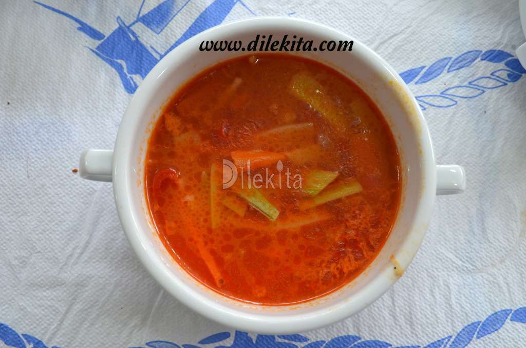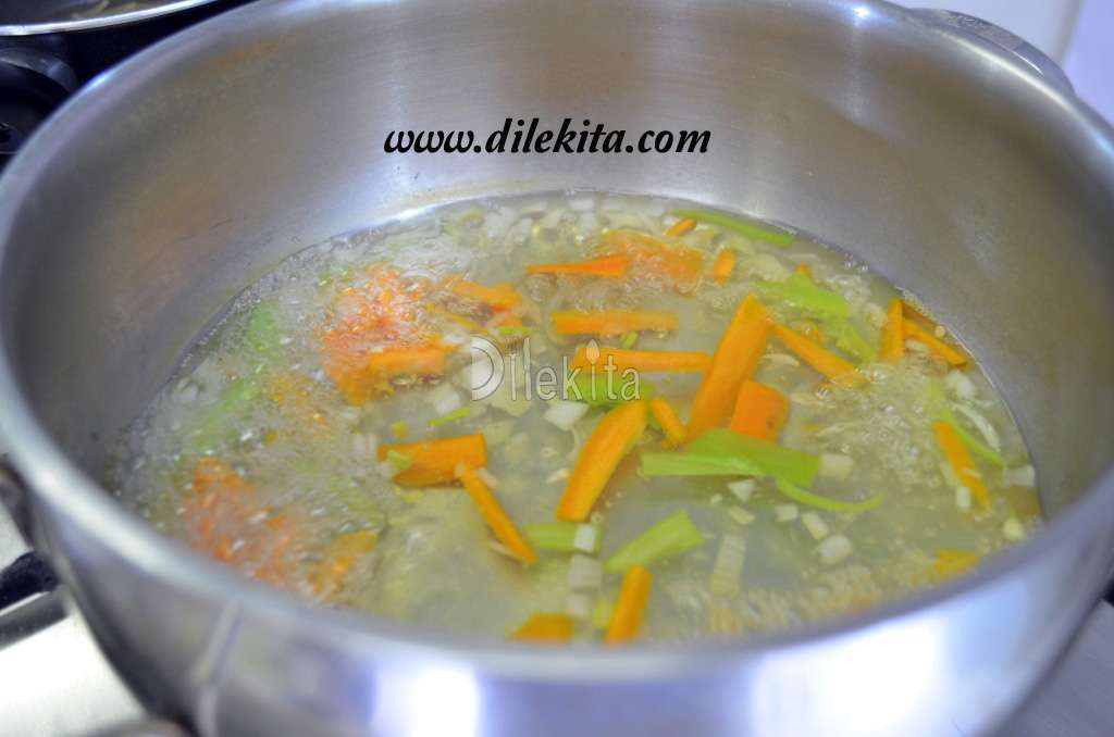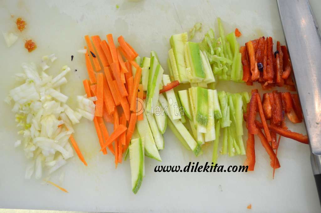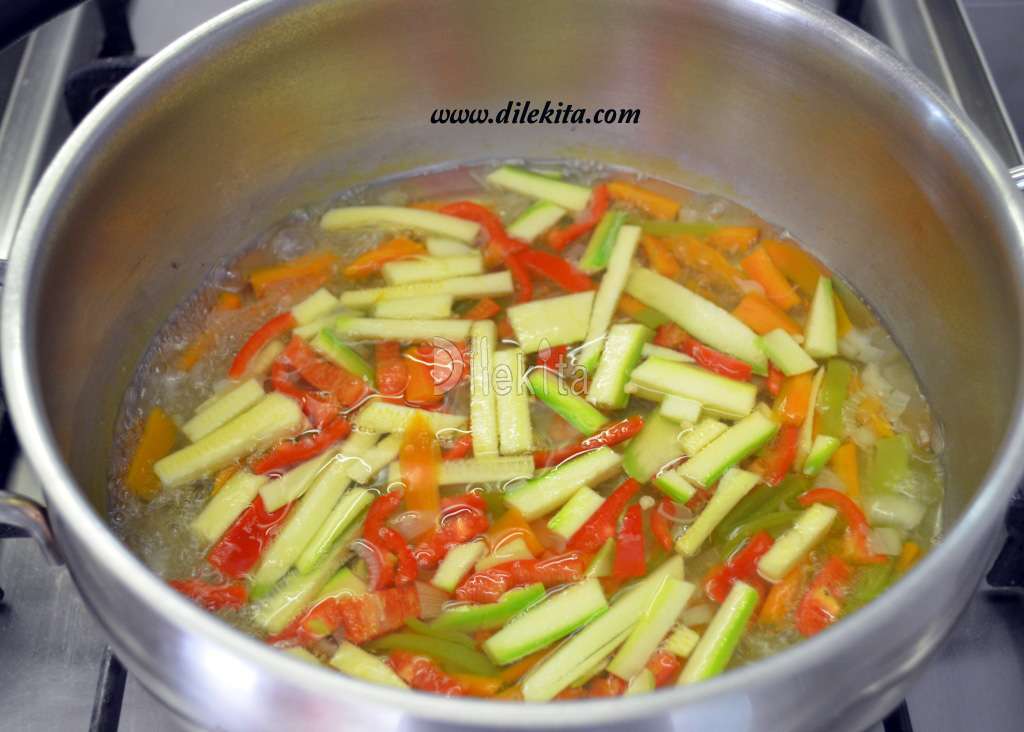 ♥ Sebzeler haşlanırken kabaklar da ufak jülyen şeklinde doğranır, (Not: Kabak yumuşak bir sebze olduğu için en son aşamada konulur.)