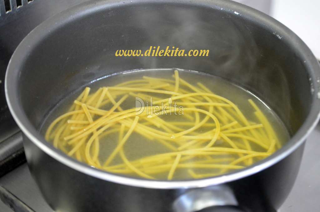 ♥ Ayrı bir tencerede makarna haşlanır, (Not: Su kaynarken değil, kaynadıktan sonra tuz eklenir. Makarna kısık ateşte pişirilmez.)