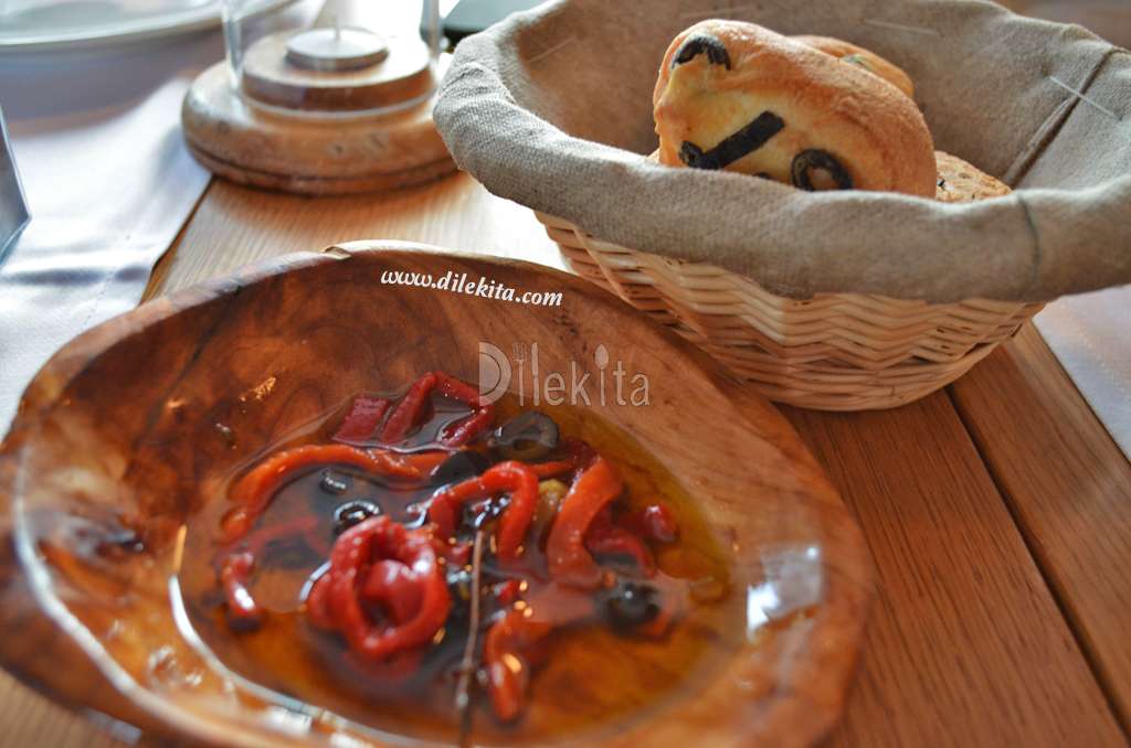 Ortaya iştah açıcı olarak zeytinyağlı zeytin tabağı, yanında ev yapımı zeytinli ekmekler geldi. Karnımın doymayacağını bilsem ekmeğimi zeytinyağına banar banar dururdum. Onun yerine kendimi durdurdum.